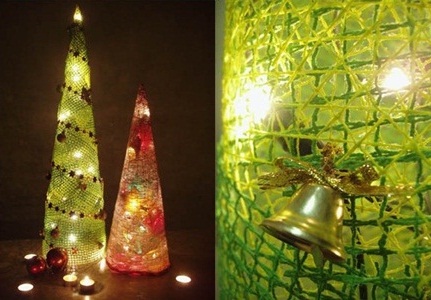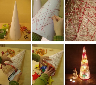 Далее можно обработать низ елки, например, лентой для подарков. Внутрь елки ставится гирлянда. Так у вас получится елочка из ниток. Но вместо них можно использовать флористическую сетку, которую вы будете наклеивать на конус небольшими отрезками в несколько слоев.