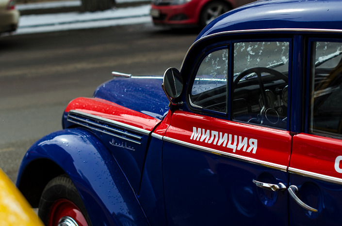 Сесть за руль старого милицейского «Москвича» — словно окунуться в другую эпоху. Небольшой, уютный салон с широким рулем и обилием хрома на приборной панели, кнопки для включения сирены, допотопная рация и микрофон для громкоговорителей на крыше. На передних дверях наклеен советский герб — как память о большой стране и упраздненной уже несколько лет народной милиции.
