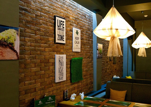 В интерьере много натуральных материалов: дерево, трава, камни. Свежий и лёгкий дизайн на первом этаже, выполненный в голубых оттенках, создаёт позитивный настрой на весь день. В цокольном этаже романтическая атмосфера — свет более приглушенный.