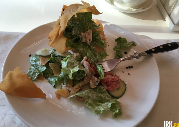 Салатные листья, куриное филе, огурцы, помидорки и приятная сметанная заправка… Всё это с элегантной небрежностью помещено внутрь причудливой конструкции из сухого теста, похожей на раковину улитки. Раковину с непредставимой для этого животного поспешностью покинула хозяйка, разворотив тем самым жилище до состояния «упс, а тут был маленький взрыв». Выглядит симпатично, на вкус — отлично. Прямо такой лёгкий летний салат. Просто вкусно. Единственный минус — слишком быстро заканчивается. Категория «попробовал — и закажу снова».