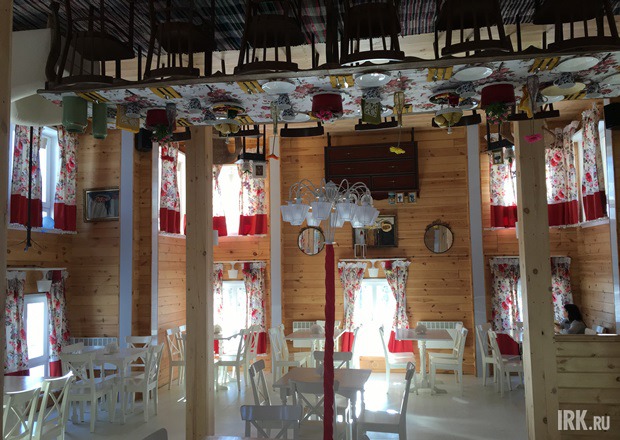 С трудом удержавшись от искушения порулить автобусом, из которого сделан вход, я миновал бар и по ступенькам, оформленным в виде томов литературных классиков, поднялся на второй этаж. Мы приехали около часу дня, и в зале было пусто. Только громко играло радио. Вдруг из недр ресторана к нам вышла официант. «Мы к вам поесть», — опасливо сказал я: вдруг эта пустота свидетельствовала о том, что повар проспал или они на спецобслуживании… Но девушка развеяла сомнения любезным «пожалуйста-пожалуйста» и даже показала стойку с «плечиками» в коридоре. Официант не представилась, но привыкать ли нам, иркутянам, к таким мелочам?