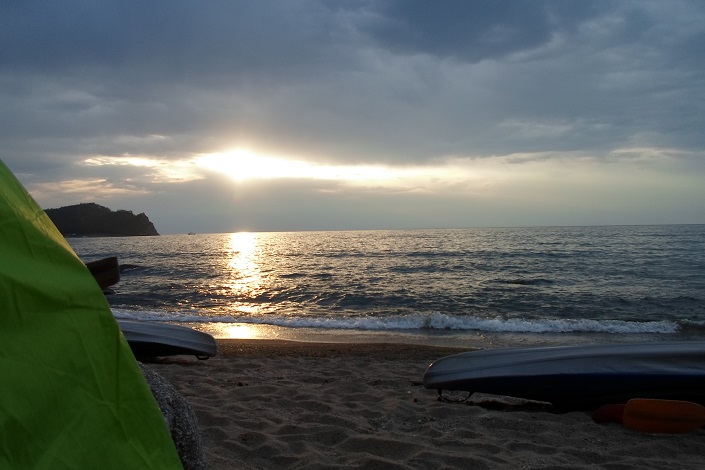 Наконец-то на горизонте появились скалы мыса Большой Колокольный, очень характерные. Справа от нас солнце уже начало скрываться за хребтом, понятно было, что нам сегодня мимо бухты Песчаной уже не пройти, а в нее смысла идти нет, так как там не разрешают ставить биваки и палатки, также нельзя вставать в бухту Бабушка. Мы начали искать по берегу, где нам сегодня ночевать. Пропускали бухту за бухтой — все не то. Наконец-то увидели что-то подходящее и решили причаливаться. Камни со всех сторон, большие волны, рев прибоя, вроде идем ровно между камней. И вдруг я вижу небольшой камень у самого берега под водой прямо по нашему курсу, ору: «Лёша! Камень! Левее!», но он меня не услышал. И как с размаху загребет, тут я уже приготовилась выпрыгивать, но поймала сильный удар и не выпрыгнула, а вылетела из лодки. К слову, первая байдарка причалилась куда мягче.