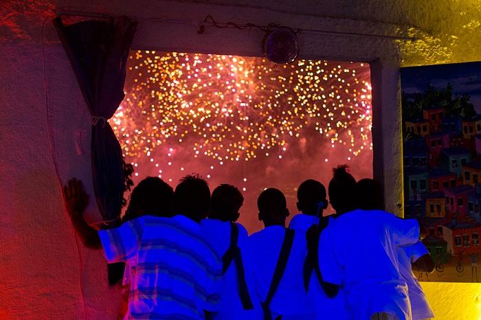 Молодые жители трущобы Паван-Паванзину смотрят праздничный фейерверк по случаю Нового года на пляже Копакабана в Рио-де-Жанейро, Бразилия.