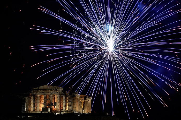 Фейерверк над древним храмом Парфеноном в Акрополе по случаю празднования Нового года в Афинах.