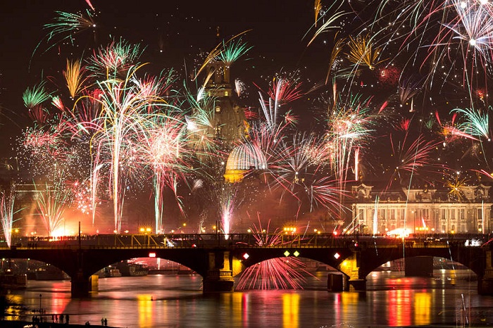 Праздничный салют по случаю Нового года в Дрездене, Германия.