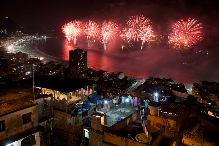 Жители трущобы Паван-Паванзину смотрят праздничный фейерверк по случаю Нового года на пляже Копакабана в Рио-де-Жанейро, Бразилия.