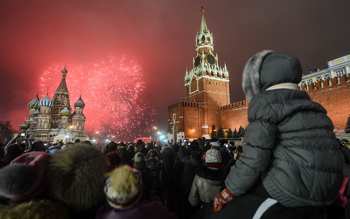 Москвичи и гости столицы, встречающие Новый год на Красной Площади, наблюдают праздничный салют.