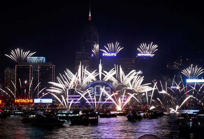 Фейерверк по случаю празднования Нового года в Гонконге.