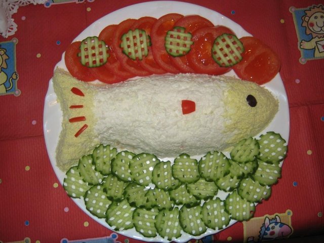 Любой салат слоеный (типа «Мимозы»), в состав которого входят рыбные составляющие, можно оформить в виде рыбки.