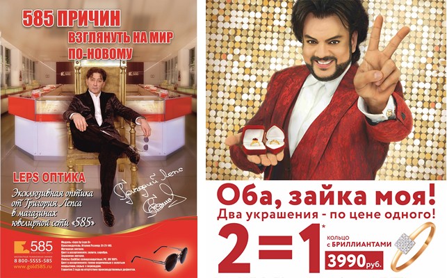 Покупателя нужно удивлять, создавать ему праздник. Ведь, покупая ювелирные украшения, человек прежде всего «покупает» эмоции. Следуя этой концепции, ювелирная сеть «585» привлекла к своей предновогодней рекламной кампании одну из самых ярких, будоражащих и харизматичных поп-звезд — Филиппа Киркорова.