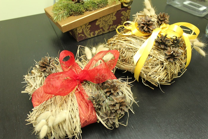 Кстати, о новогодней елке. У нас она получилась классической — в шарах, бантах и с гирляндой. Изюминкой нашей офисной красавицы стали декоративные подарки из сена. По мнению дизайнеров, для украшения елки следует использовать различные идеи. Например, вешать на ветки не только традиционные игрушки из стекла, но и фотографии, необычные самодельные подарки и другие мелочи и вкусности. Главное в этом деле — проявить фантазию.