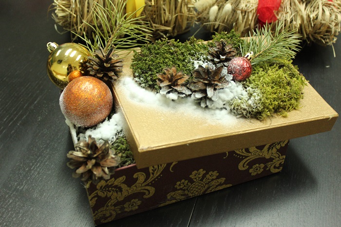 Теперь можно декорировать основание. Для этого подойдут небольшие ветки, стеклянные и вязаные игрушки. Их следует прикрепить к основанию при помощи клея.