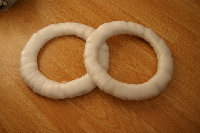 Для начала нужно подготовить каркас для венка. Для этого можно взять пенопласт и обмотать его любым мягким материалом и скотчем.