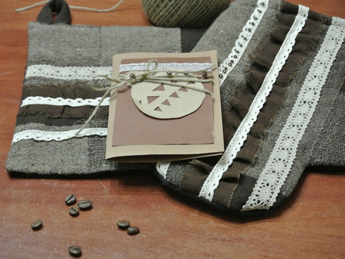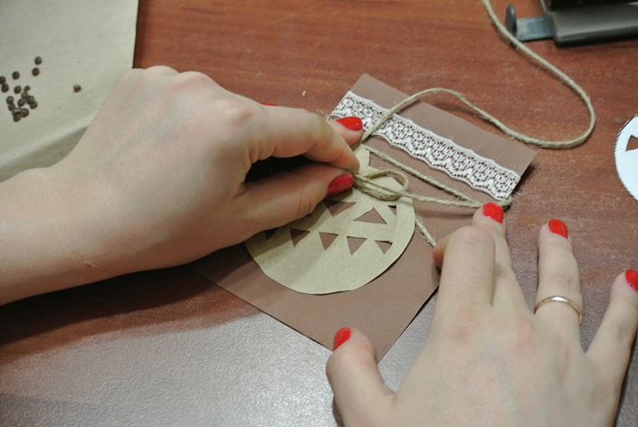 Открытку можно украсить бусинами или зернами кофе.