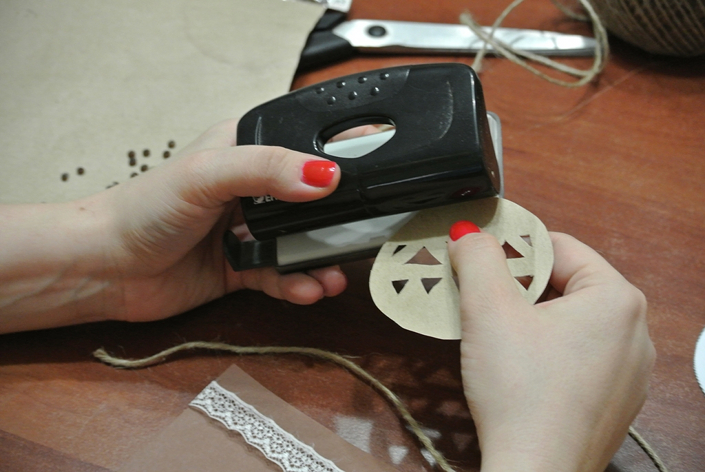 Бежевую бумагу сгибаем пополам, а из коричневой вырезаем окошечко, на 0,5 сантиметра меньше по размеру, чем открытка. Из упаковочной вырезаем елочный шар.
