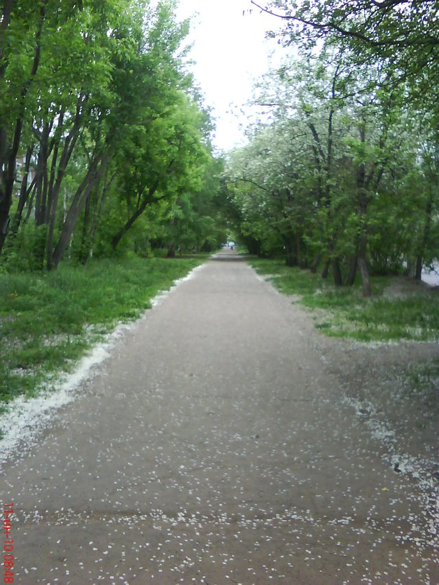 Улица Трилиссера, усыпанная цветками яблони