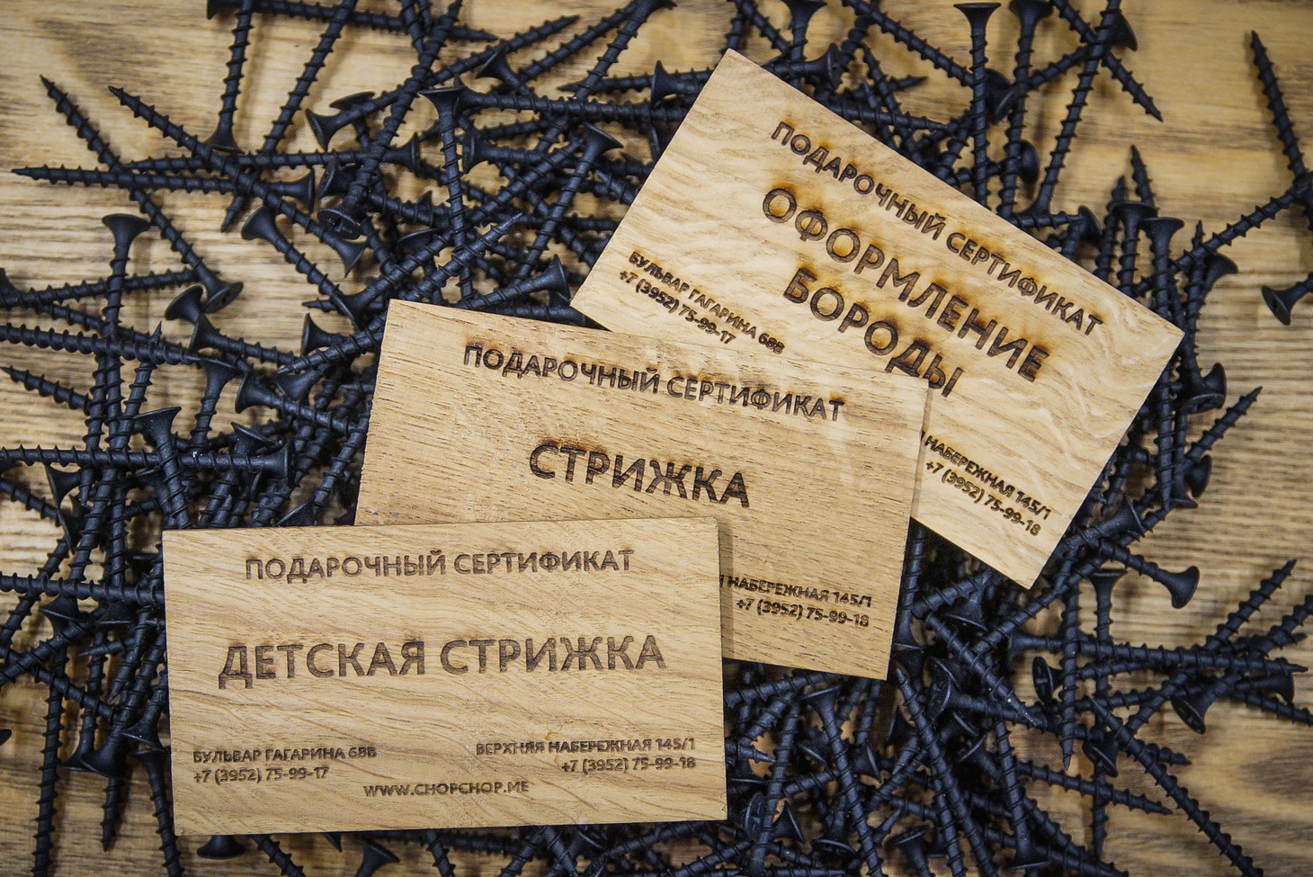 Современные мужчины привыкли следить за собой, учитывая нынешнюю моду на бороды, которые требуют постоянного ухода. Если ваш избранник не исключение, то его порадует сертификат на услуги сети парикмахерских Chop-Chop. Можно выбрать бессрочный сертификат как на услуги: стрижку, оформление бороды или усов, так и на определенные суммы. К тому же сертификаты, выполненные из дуба, просто приятно держать в руках.