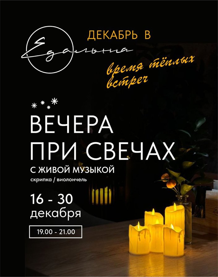 Представьте: сотни тёплых свечей, новогоднее оформление и искрящийся в полумраке живой звук виолончели или скрипки, а также изысканные блюда ресторана.