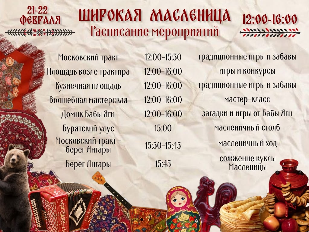 В программе: народные игры и забавы, конкурсы, поедание вкуснейших блинов, подъём гирь, перетягивание каната, «масленичный» столб с подарками, хороводы, пляски, песни, выступления фольклорных коллективов, ярмарка-продажа ремесленных изделий.