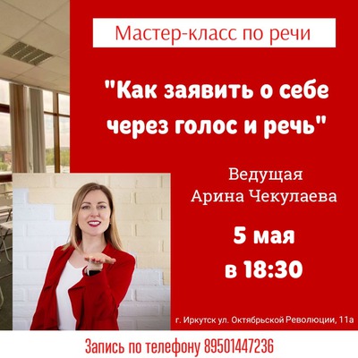 В Иркутске пройдёт мастер-класс «Как заявить о себе через голос и речь». С акцентом на то, как справляться с волнением и найти внутреннюю опору.