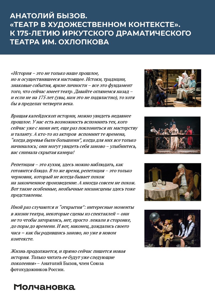 Выставка приурочена к 175-летнему юбилею Иркутского академического драматического театра им. Н. П. Охлопкова.