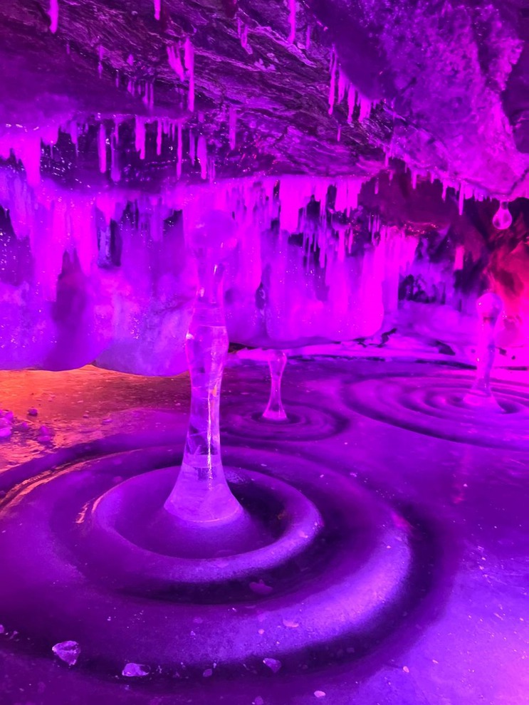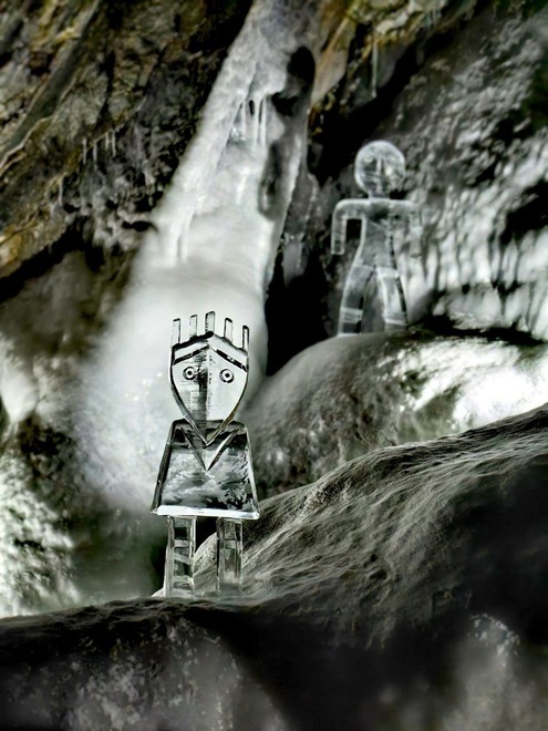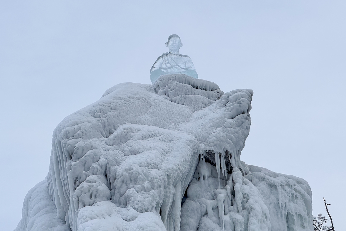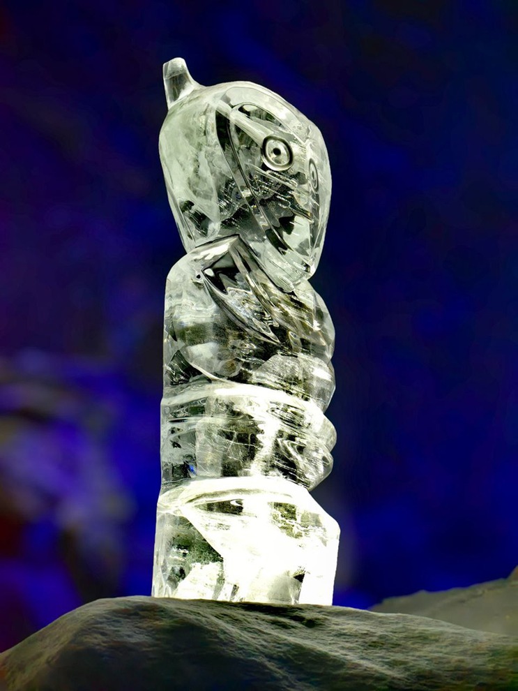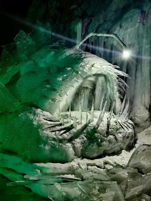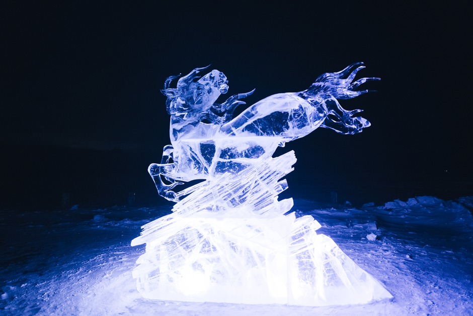 Все фигуры выполнены методом ледопластики — это когда скульптор работает не с готовыми кубами льда, а с ландшафтом. Он не использует эскиз, а видит в наплесках, ледяных волнах образы и «проявляет» их с помощью инструментов.