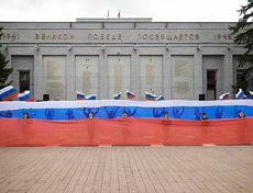 После приветственного слова официальных лиц и творческих номеров вокальных и танцевальных коллективов участники растянули на территории мемориального комплекса 25-метровый триколор.