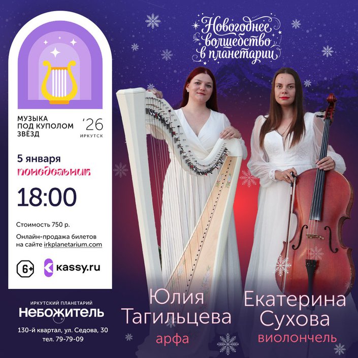 Юлия Тагильцева (арфа) и Екатерина Сухова (виолончель) будут дарить вам самые нежные новогодние мелодии.