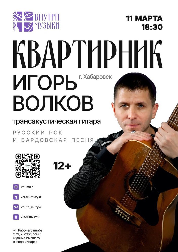 Бард Игорь Волков (Хабаровск), участник фестивалей «Мечта», «Амур-фест» и «Поющий ангел», уже подготовил для иркутян разнообразную программу. В его репертуаре кавер-версии композиций известных групп, а ещё много интересных авторских песен.