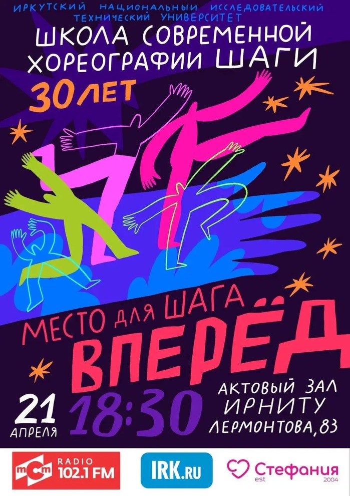 В программе концерта «Место для шага вперед» зрители увидят номера, появившиеся в репертуаре коллектива за пять лет. Работы приглашённых постановщиков, иркутских мастеров, а также педагогов-постановщиков Школы современной хореографии «Шаги», большинство из которых и сами являются выпускниками «Шагов».