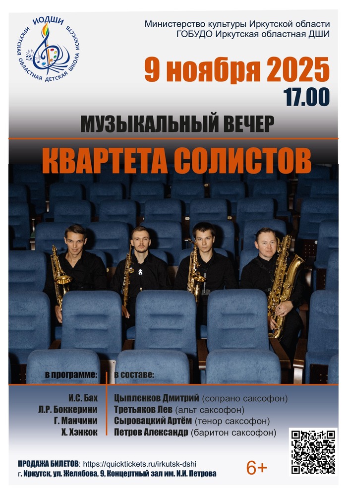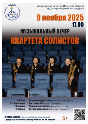 Музыкальный вечер Квартета солистов в Концертном зале им. И.И. Петрова Иркутской областной детской школы искусств.