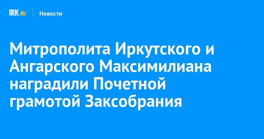 30 июня на сессии областного парламента председатель Александр Ведерников вручил Почетную грамоту Заксобрания Иркутской области епархиальному архиерею религиозной организации «Братская Епархия Русской Православной Церкви (Московский Патриархат)», митрополиту Иркутскому и Ангарскому Максимилиану. Спикер отметил достижения митрополита в организации благотворительной и попечительской деятельности в регионе.