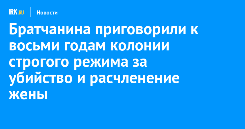 11 августа Братский городской суд приговорил 58-летнего мужчины, убившего и расчленившего свою жену, к восьми годам и одному месяцу колонии строгого режима. Преступление братчанин совершил на фоне длящегося несколько дней алкогольного опьянения.