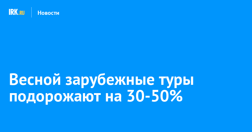 Стоимость зарубежных туров с апреля вырастет на 30-50%, поскольку закончатся акции раннего бронирования, пишет «Российская газета» со ссылкой на исполнительного директора Ассоциации туроператоров России (АТОР) Майю Ломидзе. Туры по России так сильно не подорожают.