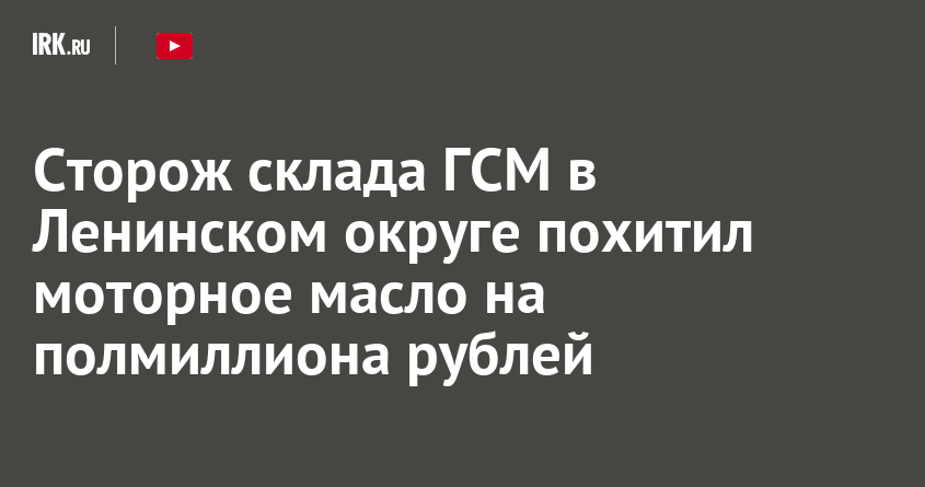 В Ленинском округе Иркутска сторож склада ГСМ похитил пять тонн моторного масла. Сумма ущерба составила 500 тысяч рублей. Полицейские задержали подозреваемого, сообщает пресс-служба ГУ МВД России по Иркутской области.