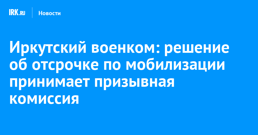 Окончательное решение о предоставлении отсрочки по мобилизации принимает призывная комиссия муниципалитета, рассказал военный комиссар Иркутской области Евгений Фуженко в прямом эфире 13 октября. Комиссии возглавляют мэры муниципальных образований.