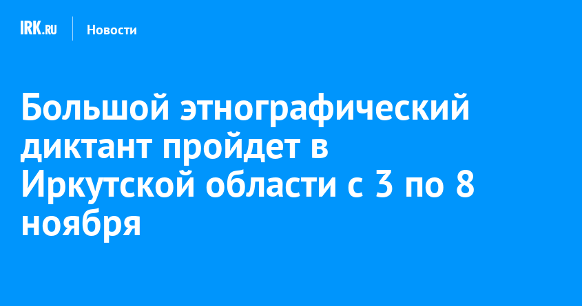 С 3 по 8 ноября в седьмой раз пройдет международная просветительская акция «Большой этнографический диктант». Ее проведут в канун Дня народного единства в онлайн- и офлайн-форматах. Начало написания диктанта в очном режиме — 3 ноября в 11:00. Организатором акции является Федеральное агентство по делам национальностей и правительство Иркутской области, сообщает пресс-служба администрации областного центра.