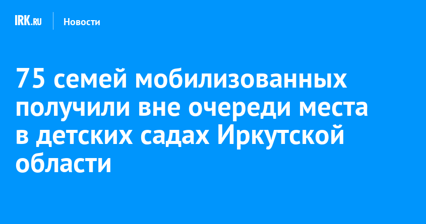 В Иркутской области 75 семей мобилизованных вне очереди получили места в детских садах. Меру поддержки семей военнослужащих, призванных в рамках частичной мобилизации, приняли в регионе по распоряжению губернатора Иркутской области Игоря Кобзева. Об этом сообщают в пресс-службе правительства региона.