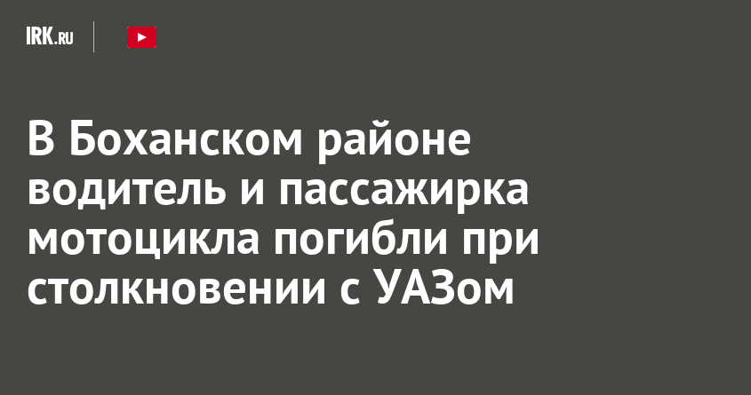 В Боханском районе 7 мая около 22:00 произошло ДТП. На 14 километре автодороги «Олонки-Шарагун» 37-летний мотоциклист на ИЖ Юпитер-5 врезался в стоящий УАЗ. В результате столкновения погиб водитель мотоцикла и его 30-летняя пассажирка, сообщает пресс-служба ГУ МВД России по Иркутской области.