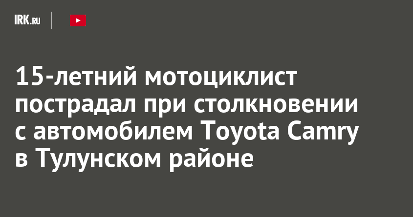 Днем 22 октября на автодороге А331 «Вилюй» в районе поселка Целинные Земли Тулунского района произошло ДТП. 15-летний школьник, управляя мотоциклом, не уступил дорогу и столкнулся с автомобилем Toyota Camry, который двигался по главной дороге. Об этом сообщает пресс-служба ГУ МВД России по Иркутской области.