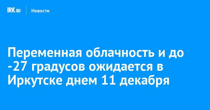 11 декабря в Иркутске ожидается переменная облачность, без осадков. Ветер 2—7 метров в секунду, температура днем -25… -27 градусов, сообщает Иркутский гидрометцентр.