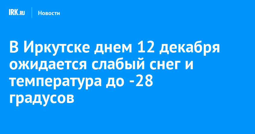 Днем 12 декабря синоптики прогнозируют переменную облачность и слабый снег в Иркутске. Ожидается ветер 2—7 метров в секунду, температура -26… -28 градусов. 12—16 декабря в Иркутске сохранится аномально холодная погода со среднесуточной температурой на 7… 17 градусов ниже климатической нормы.