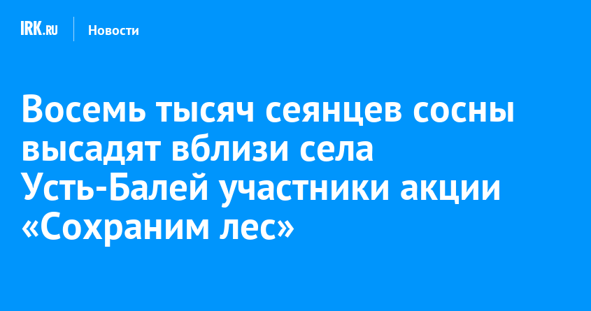 В этом году Иркутская область вновь присоединится к всероссийской акции «Сохраним лес». Главное мероприятие акции состоится 6 сентября в Иркутском лесничества: в районе села Усть-Балей волонтеры высадят восемь тысяч сеянцев сосны с закрытой корневой системой на площади четыре гектара. Ожидается, что в акции примут участие около 450 человек, сообщает пресс-служба правительства региона. Сеянцы вырастили в Мегетском лесопитомнике.