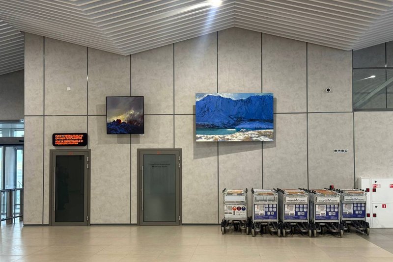 Главный акцент выставки — шестиметровое полотно с видом на зимний Байкал. Оно расположено в зоне встречающих. Остальные работы художника встречают пассажиров в зоне выдачи багажа.