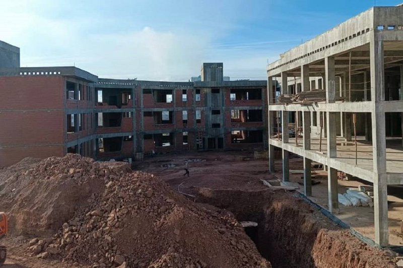 На стройплощадке завершили работы по гидроизоляции фундамента и утеплению цокольного этажа, построили основной каркас здания. Ведутся работы по кирпичной кладке, бетонированию подпорной стенки и устройству наружных инженерных сетей. Готовность составляет 30%, объект намерены достроить в 2027 году.