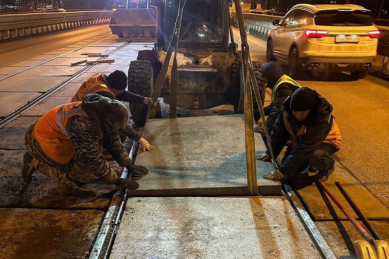 Специалисты «Службы эксплуатации мостов» заменили 11 бетонных плит на Глазковском мосту. Работы проводили ночью, когда трамваи не ездят по маршруту. Это позволило сделать все быстро и безопасно, рассказал руководитель предприятия Андрей Пономарев.