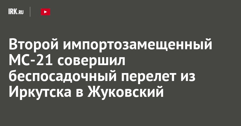 Второй опытный образец российского самолета МС-21 с отечественными комплектующими совершил беспосадочный перелет из Иркутска в Жуковский. Полет длился 6 часов 15 минут и прошел в штатном режиме на высоте около 11 тысяч метров и скоростью 800 километров в час, сообщили в телеграм-канале ПАО «ОАК».