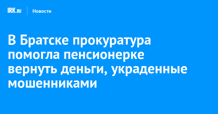 Прокуратура Падунского района Братска добилась полного возмещения средств, похищенных мошенниками у местной жительницы. В пользу пенсионерки взыскали 115 тысяч рублей, сообщили в пресс-службе прокуратуры Иркутской области.