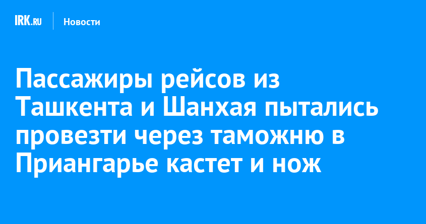 На таможенном посту Аэропорт Иркутск пресекли несколько попыток ввезти в регион опасные и незадекларированные предметы. Из багажа пассажиров рейсов из Ташкента и Шанхая изъяли нож и кастет, которые, по предварительной оценке, могут обладать признаками оружия колюще-режущего и ударно-дробящего действия. Сейчас изъятые предметы направили на экспертизу для окончательного решения об их классификации, сообщили в пресс-службе Иркутской таможни.