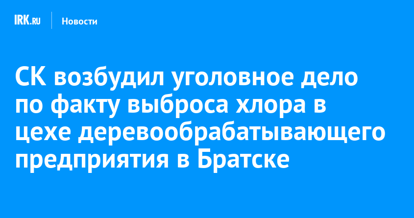 Следственный отдел по городу Братску СУ СК России по Иркутской области возбудил уголовное дело по признакам преступления, предусмотренного статьей 246 УК РФ «Нарушение правил охраны окружающей среды при производстве работ». С 21 на 22 января в цехе деревоперерабатывающего предприятия из-за нарушения правил охраны окружающей среды при эксплуатации промышленных объектов произошел выброс хлора. В результате происшествия пострадали шесть человек.